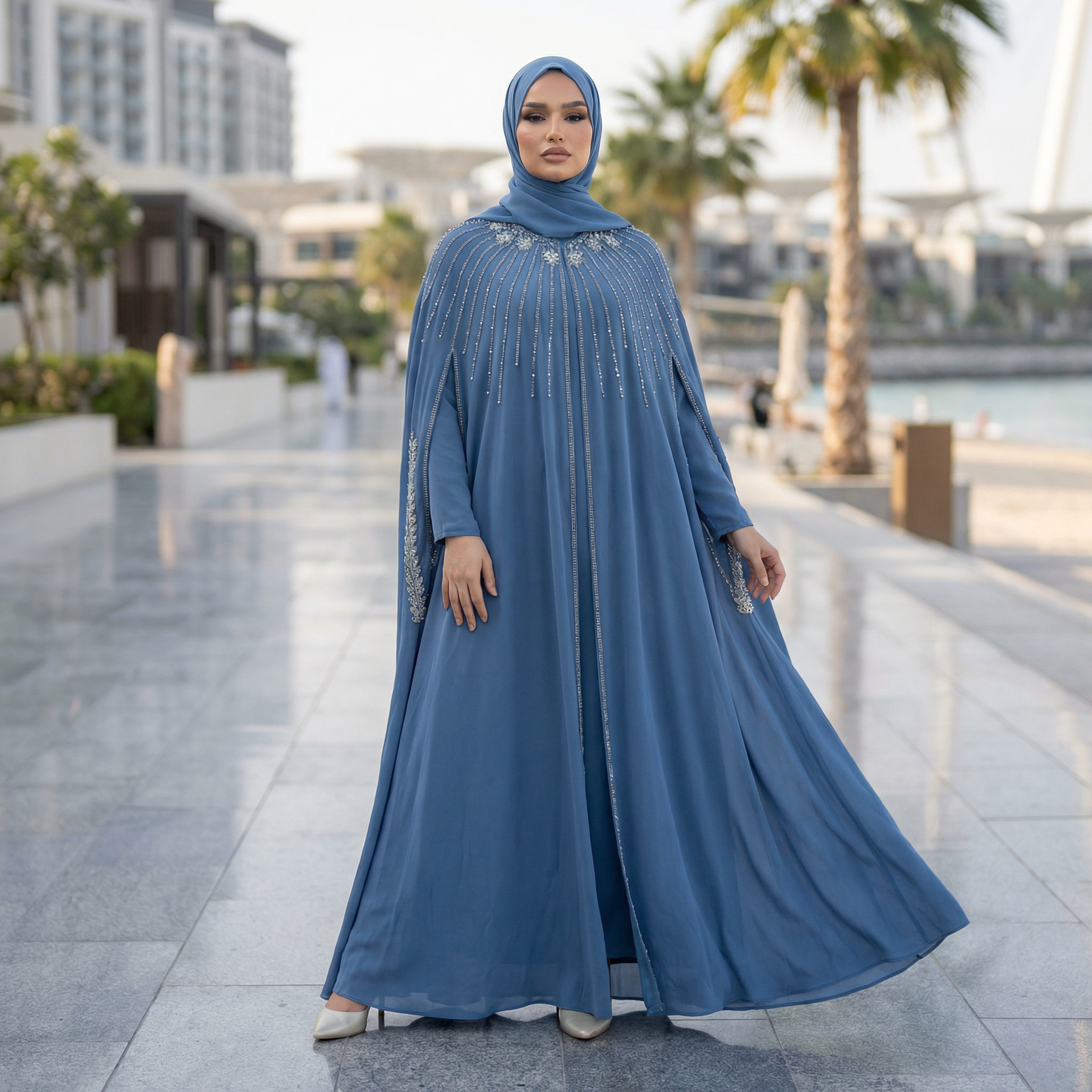 3 Piece Abaya with Embroidered Trim and Stone Detail - Bit of Blue