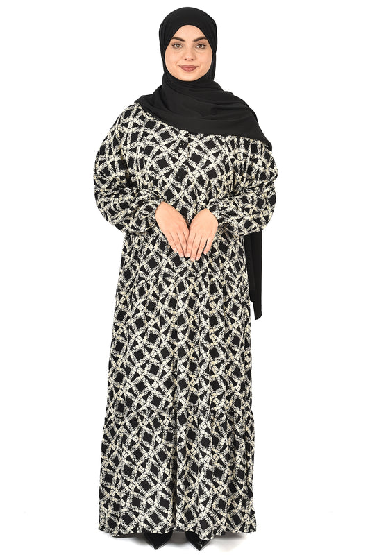 Elegant Women’s Abaya with Black and White Geometric Print ( guz dress )