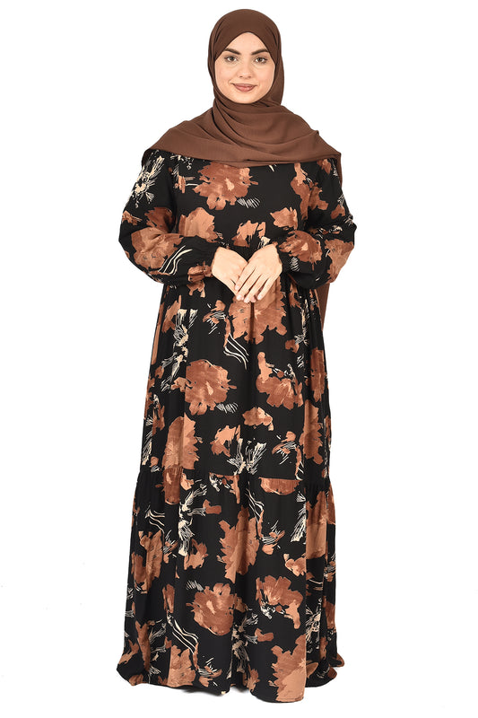 Black Floral Abaya with Earthy Tones – Classic Meets Contemporary ( guz dress )
