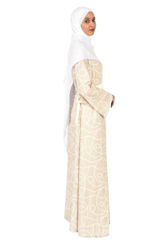 Elegant Beige Abaya with White Patterns & Waist Belt (katalia )
