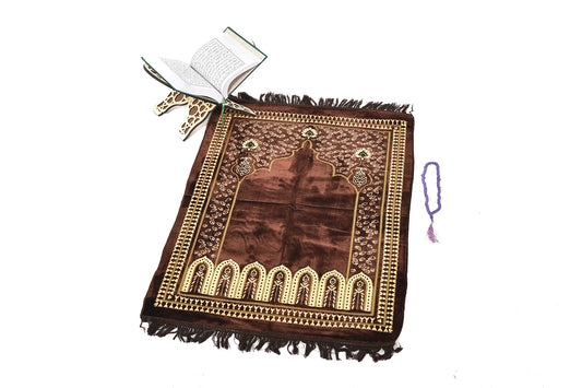 Premium Prayer Rug – Islamic Design with Gold Embroidery on Brown Background ( musallahs )