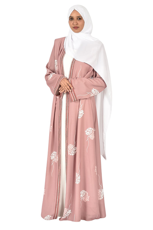 Beige Abaya with White Floral Embroidery and Golden Trim _katalia