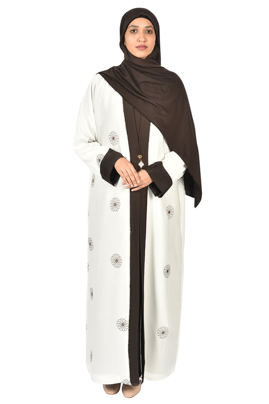 White Floral Embroidered Abaya with Brown Accents (ladies abaya )