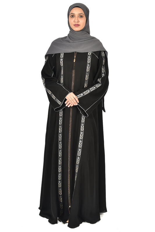 Black Abaya with Silver Leaf Embroidery and Zipper Front ( ladies abaya )
