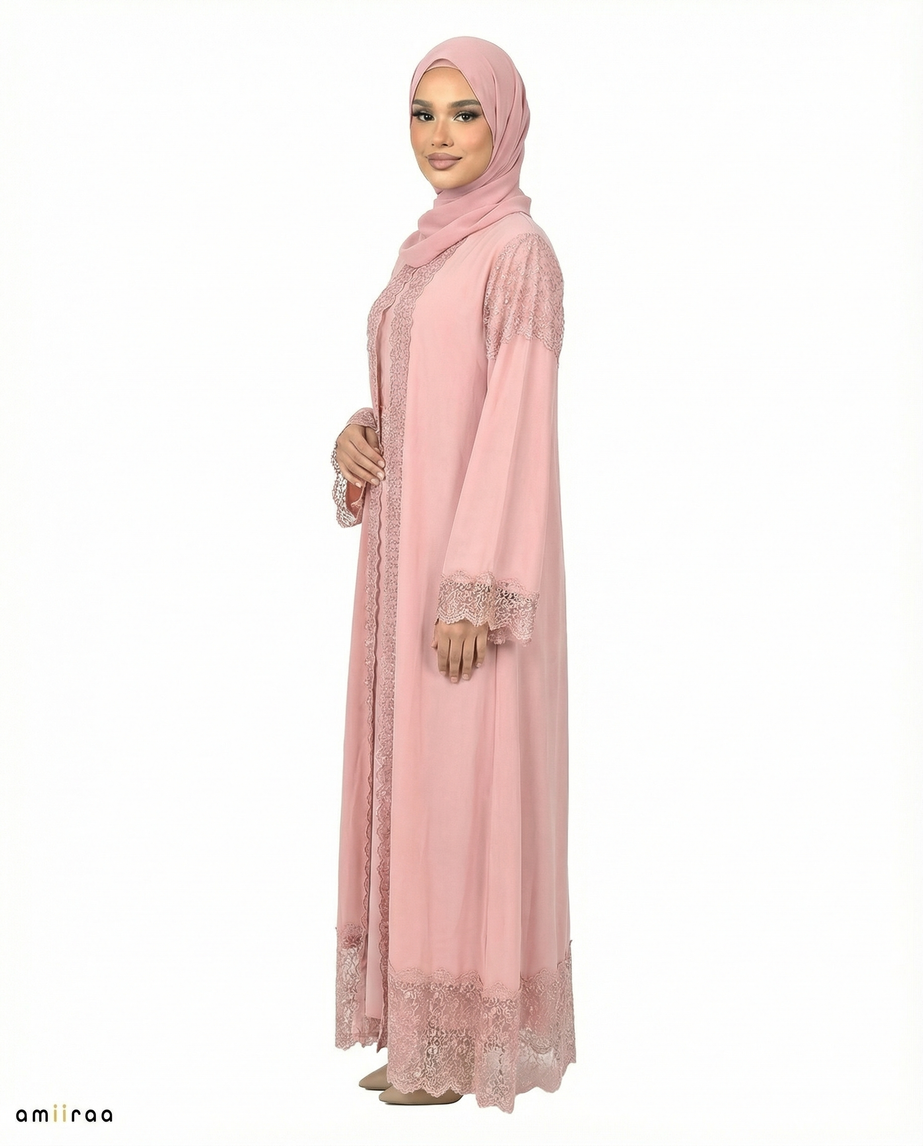 3 Piece Chiffon Abaya Set with Lace and Stone Detail - Mellow Rose