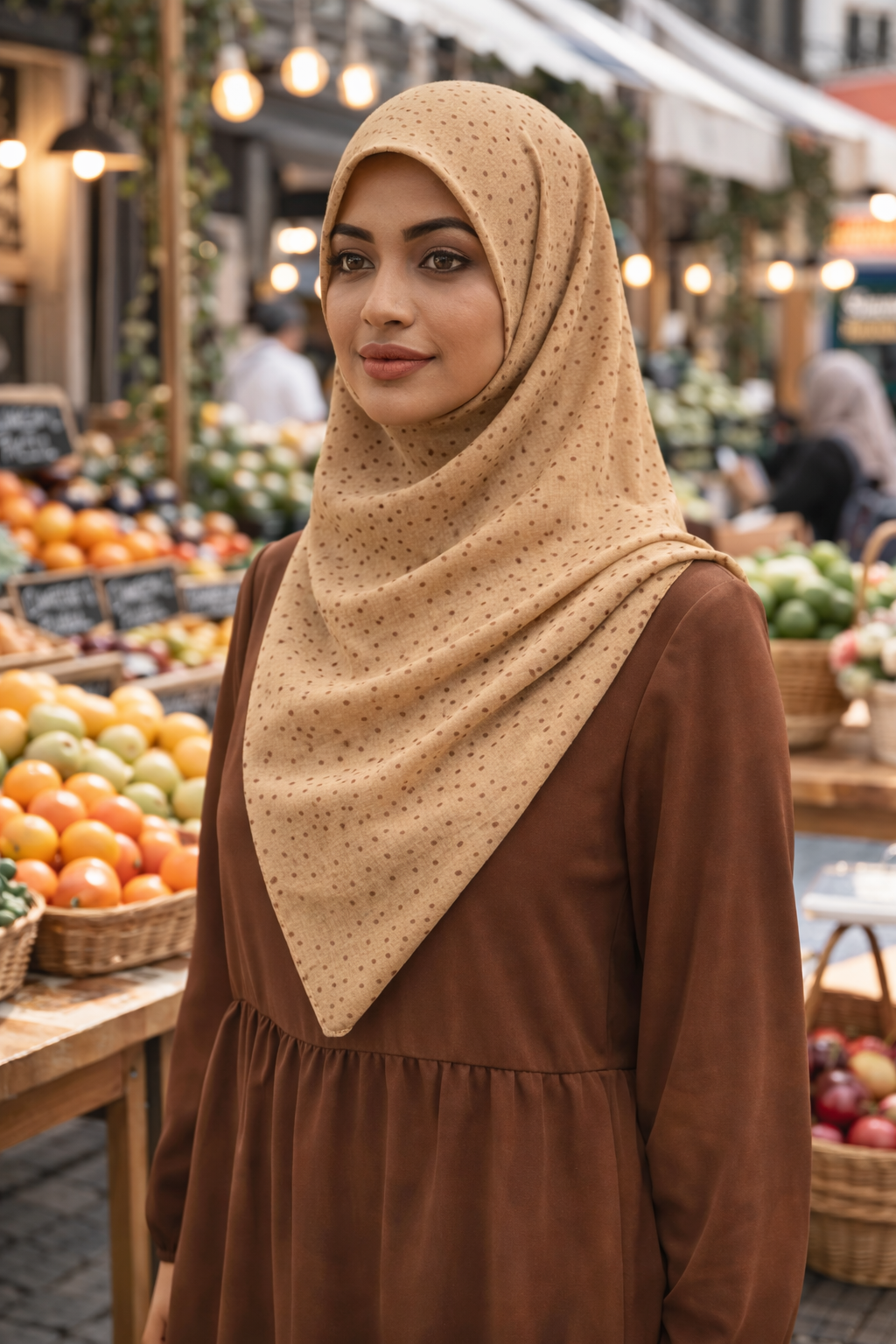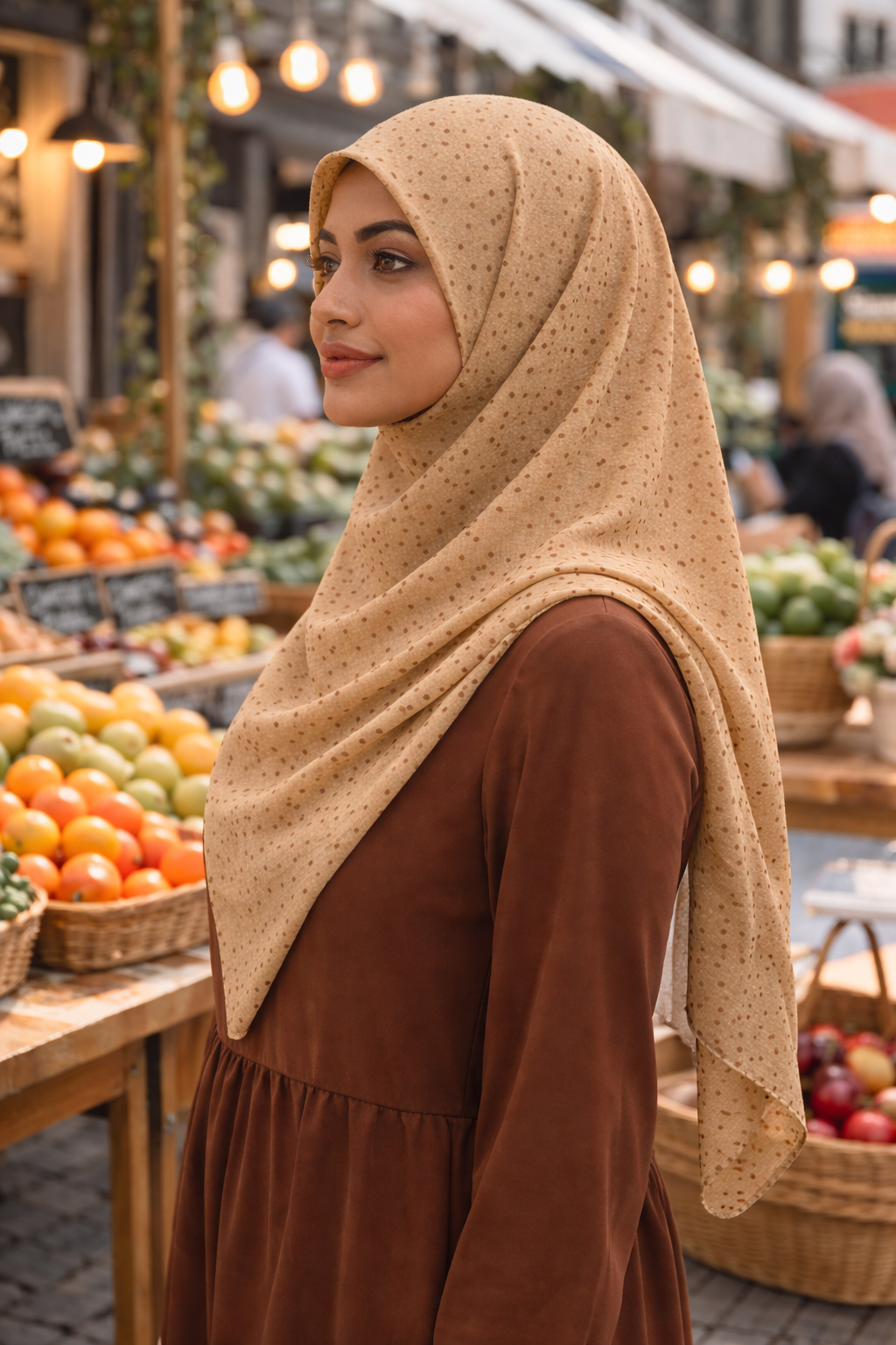 Crafted from soft, lightweight chiffon, this rectangular scarf measures 1.8m x 0.7m, offering beautiful coverage with a graceful, flowing drape. The warm affogato-toned base is delicately adorned with polka dots, complemented by subtle larger circular accents that create gentle dimension and visual interest without overwhelming the design. Breathable and comfortable, this chiffon scarf is perfect for daily wear and can be styled neatly around the neck or elegantly draped on the head for modest dressing.