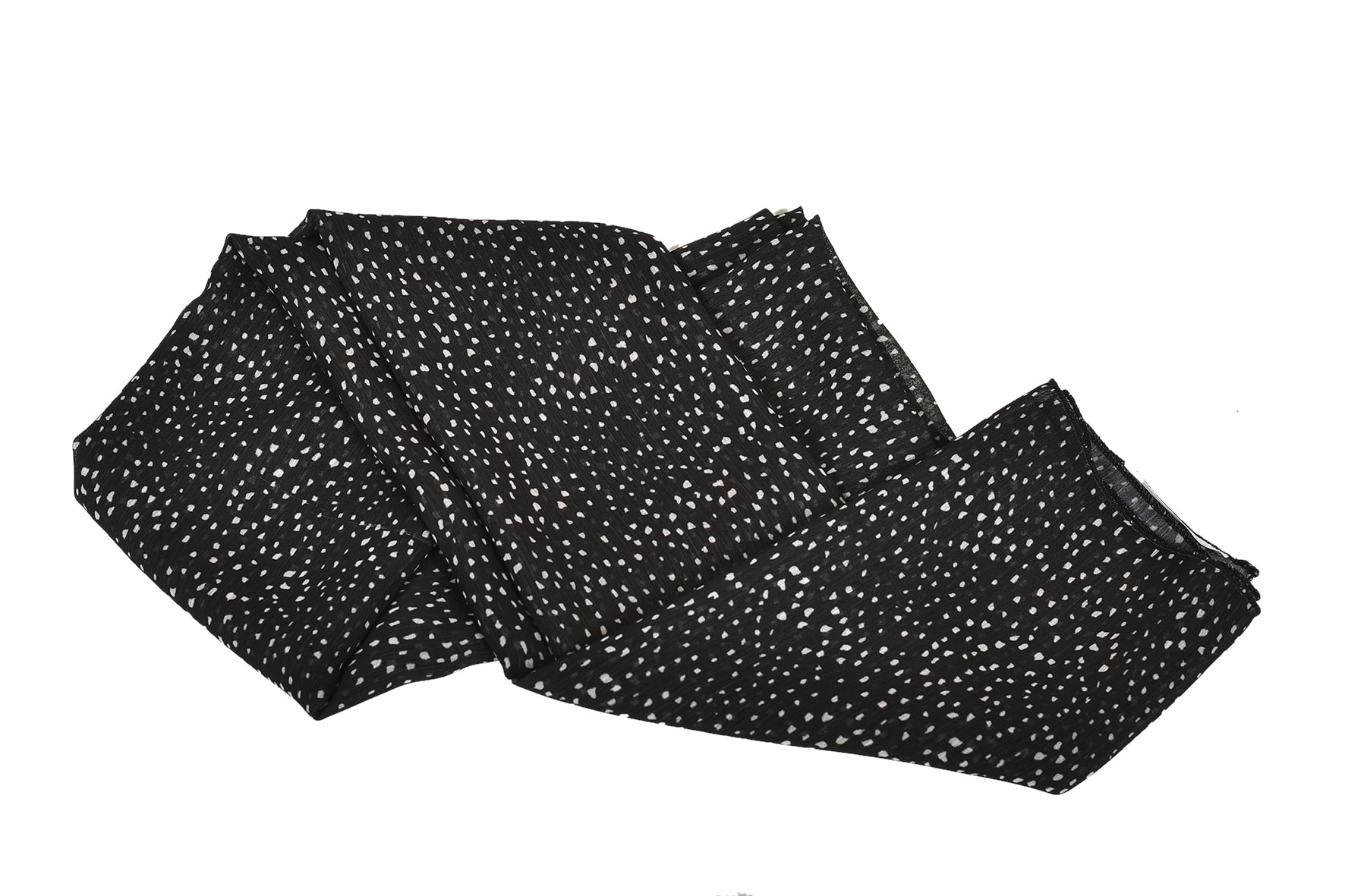 Crafted from soft, lightweight chiffon, this rectangular scarf measures approximately 1.8m x 0.7m, offering graceful drape and comfortable coverage. The rich anthracite black base is beautifully complemented by scattered white speckled detailing, creating a refined contrast that adds subtle texture and depth. The breathable chiffon fabric ensures comfort throughout the day, whether styled neatly around the neck or wrapped elegantly as a headscarf.