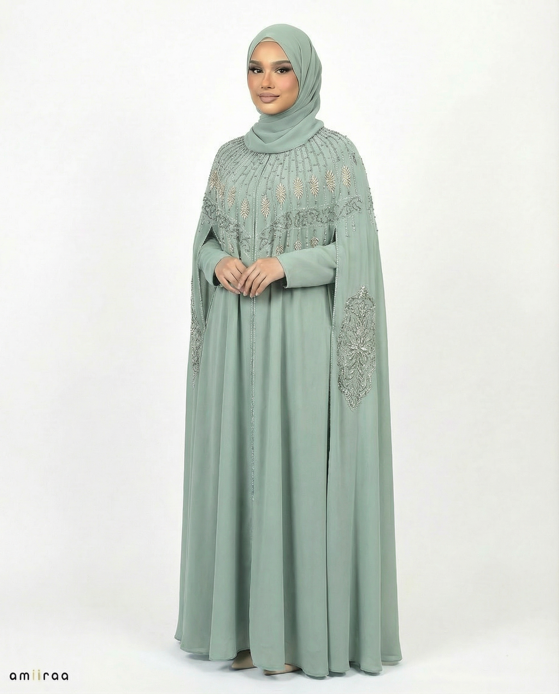 Crafted in a soft, flowing chiffon, the set features a beautifully layered silhouette — an inner long-sleeve dress paired with a delicately embellished outer cloak. The cape overlay drapes effortlessly from the shoulders, creating fluid movement with every step while maintaining a modest, regal presence.