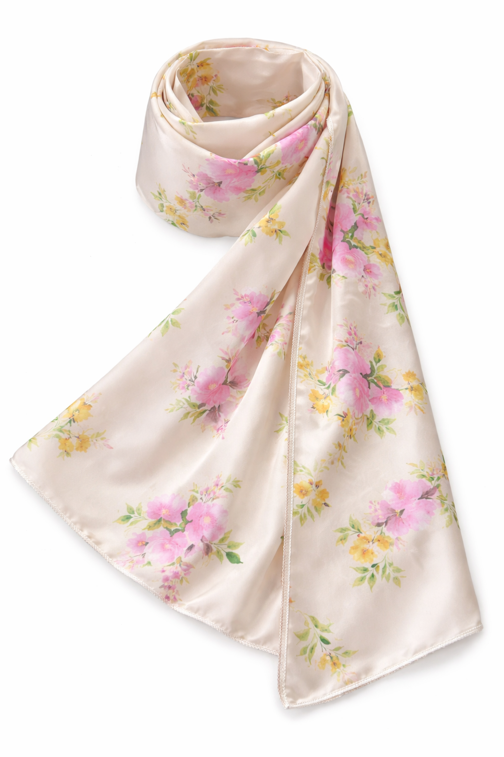 Crafted from smooth, lightweight satin, this rectangular scarf measures 1.8m x 0.7m, offering beautiful coverage with a soft, fluid drape and a subtle luminous sheen. The creamy base is adorned with baby breath–inspired floral prints in soft pink tones, accented with gentle yellow blossoms and fresh green leaves. The balanced floral arrangement creates a romantic, airy aesthetic that adds charm and refinement without overpowering your look. Silky and comfortable against the skin, this satin scarf is perfect for both daily wear and special occasions, styled elegantly around the neck or draped as a hijab for modest dressing.