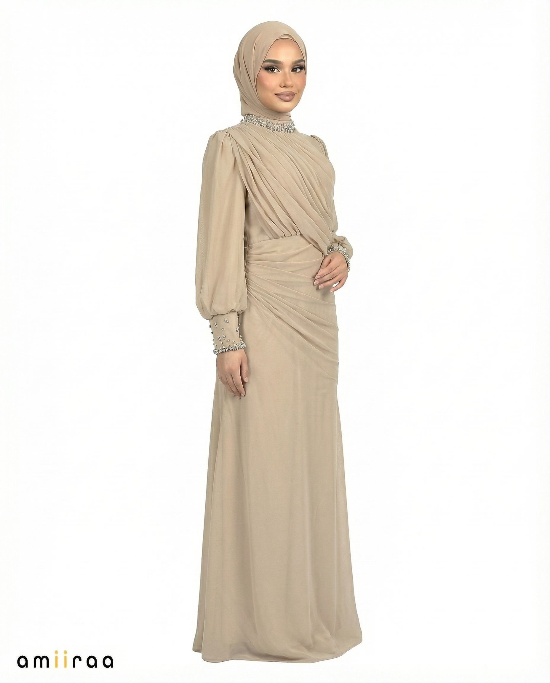 Gracefully draped and delicately embellished, this full-length chiffon gown is the definition of refined modest elegance.