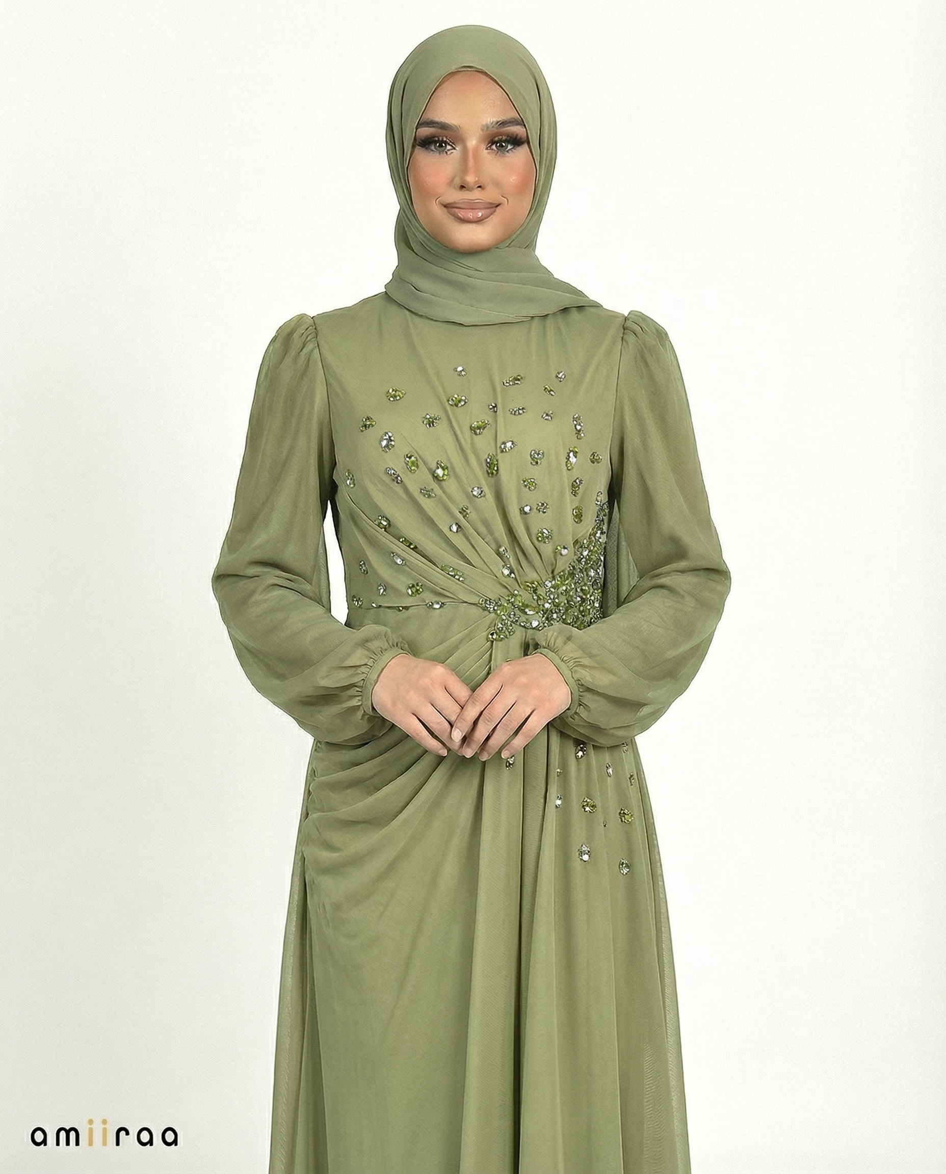 This dress blends modest elegance with modern detailing — a statement piece designed to stand out gracefully.