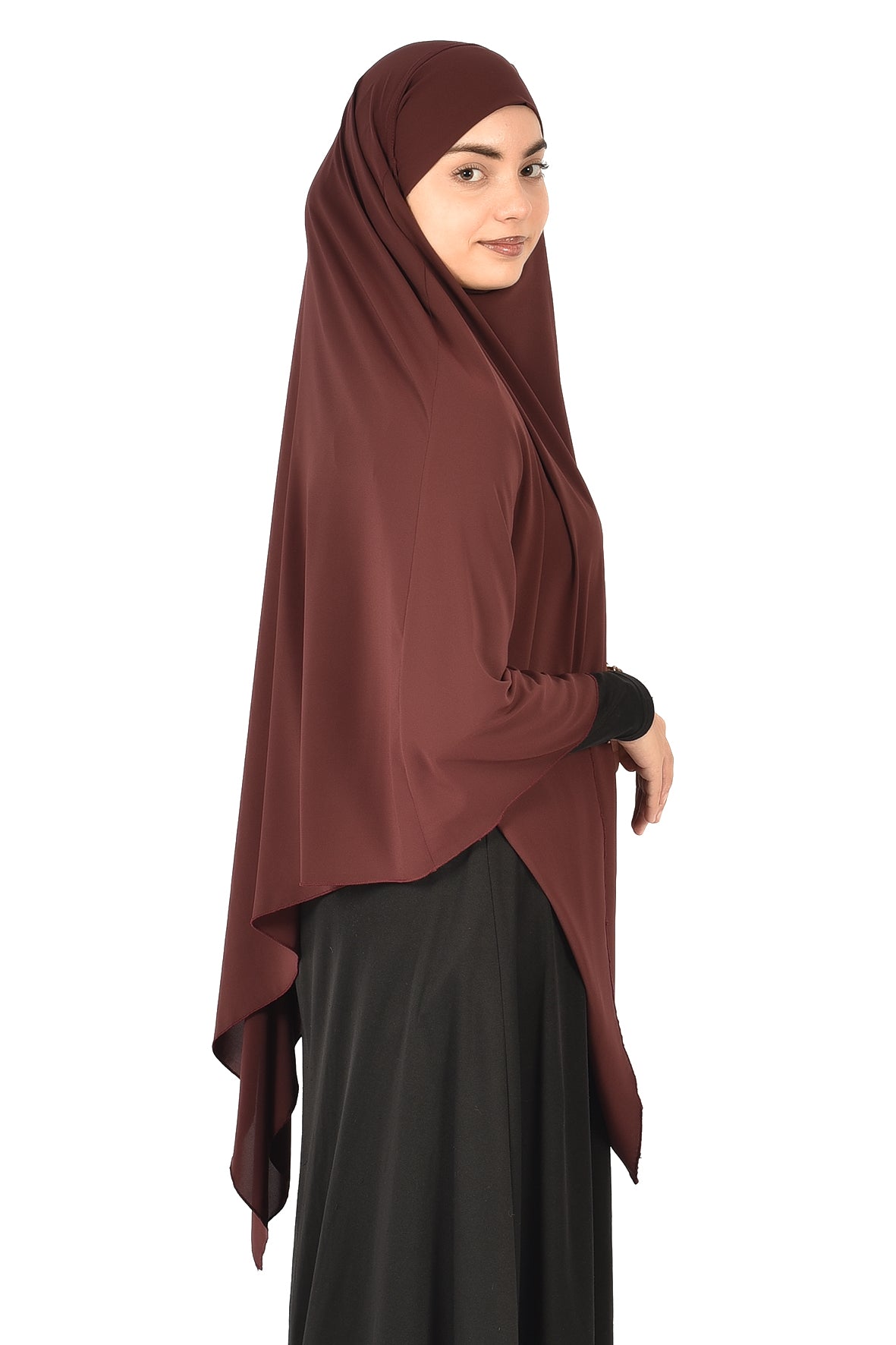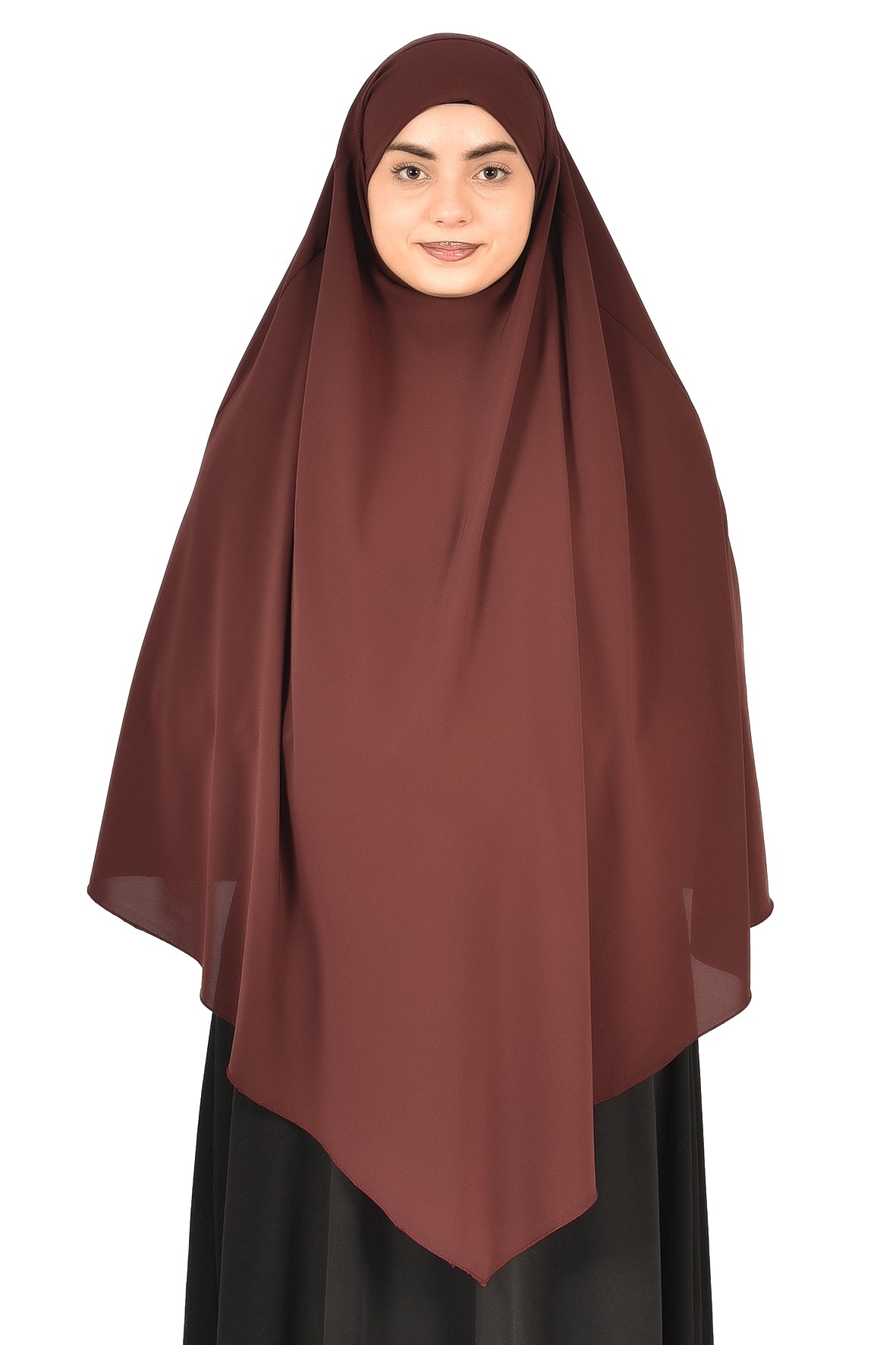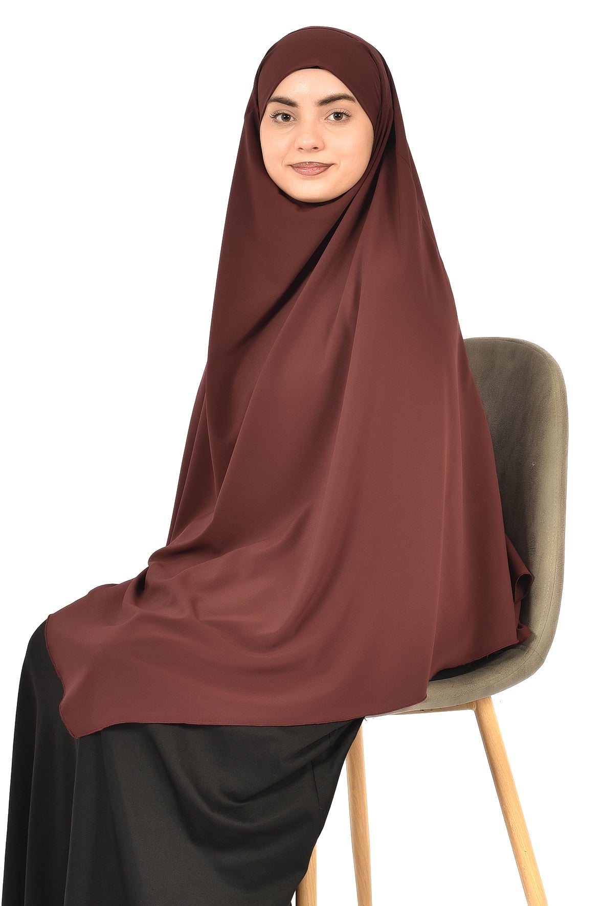Enjoy a modest and stylish look with this elegant khimar in a rich dark chocolate brown shade. Made from soft, breathable crepe fabric, it ensures maximum comfort throughout the day. Designed with full chest and shoulder coverage and a comfortable face opening, it’s perfect for all seasons. Available in multiple colors to match your outfits, making it a practical and elegant choice for any occasion.