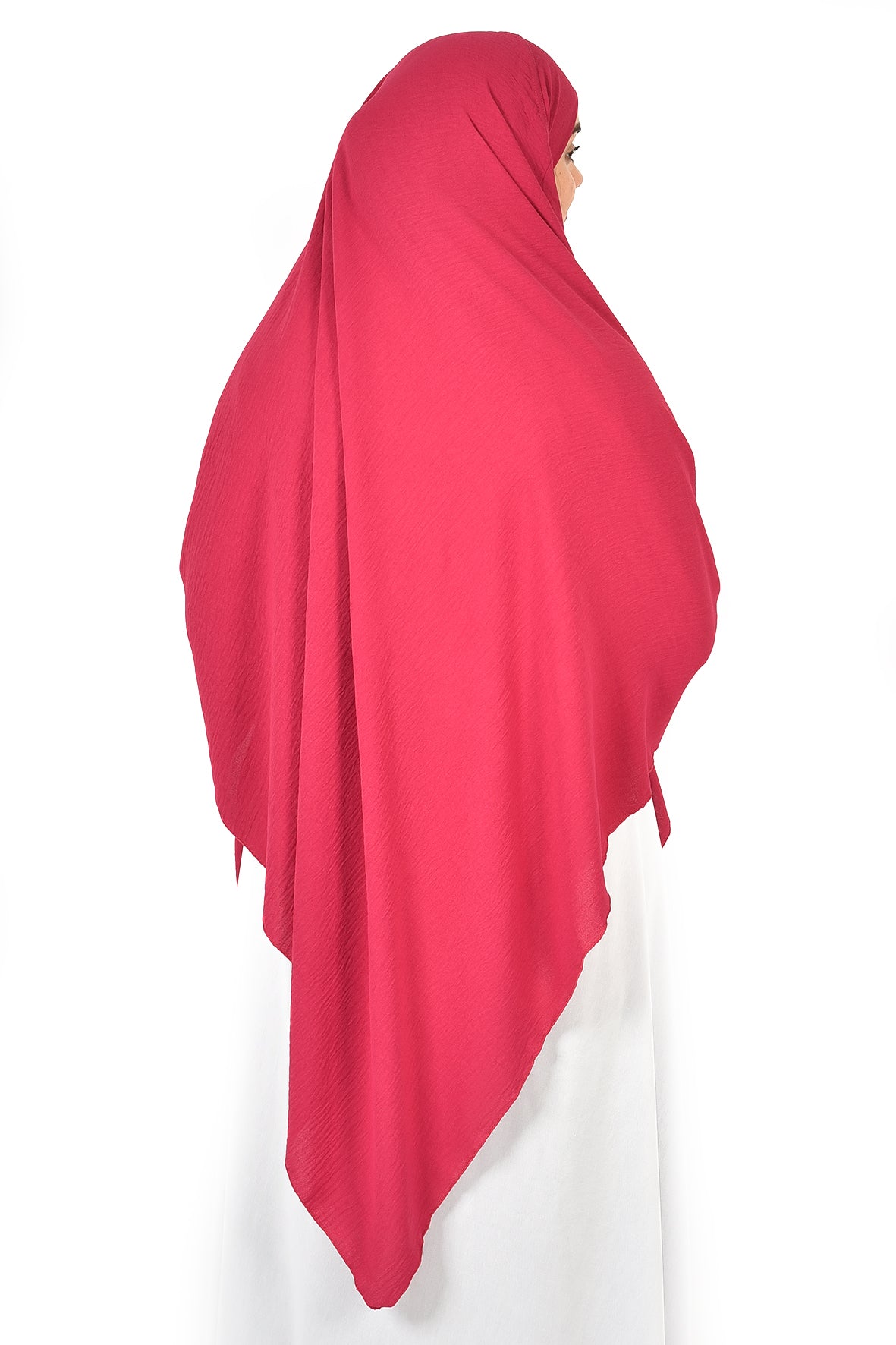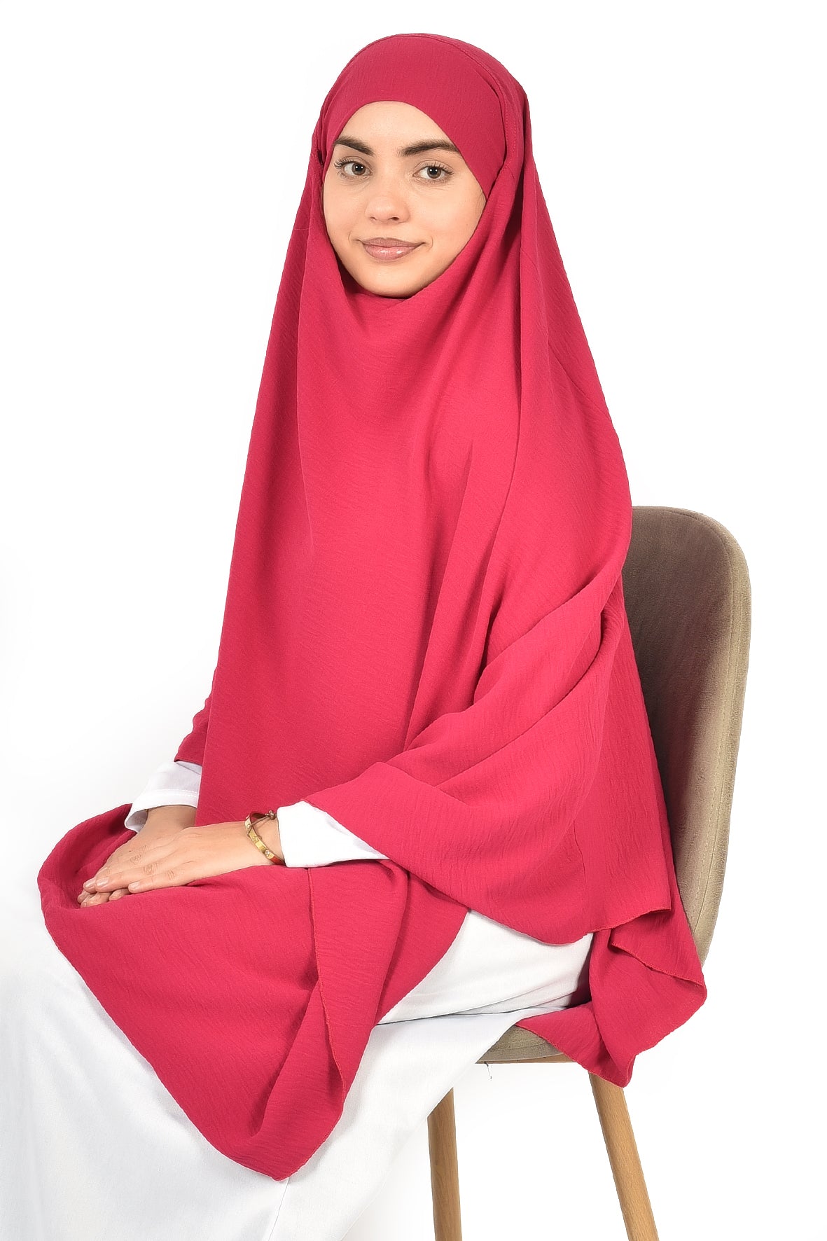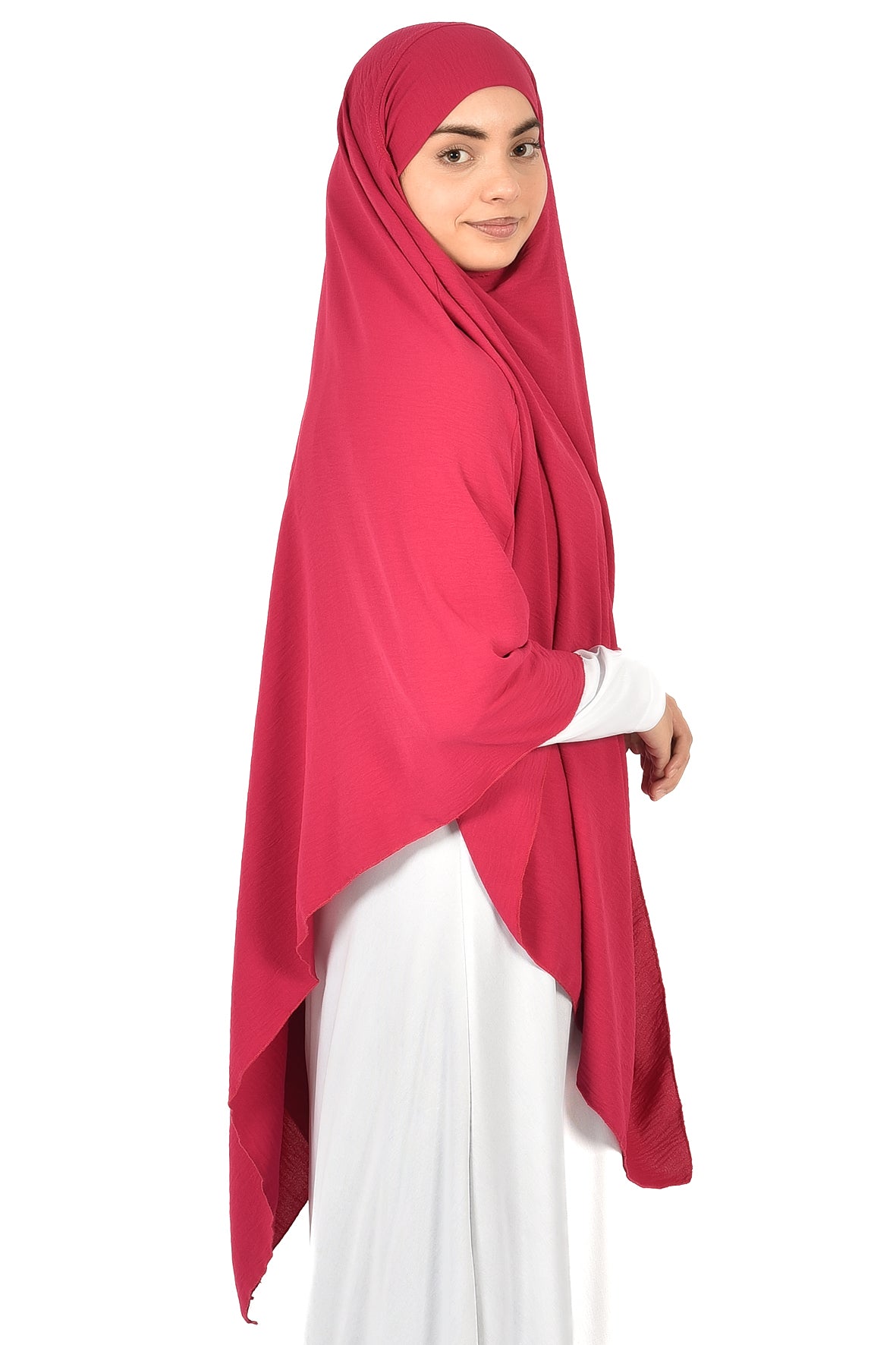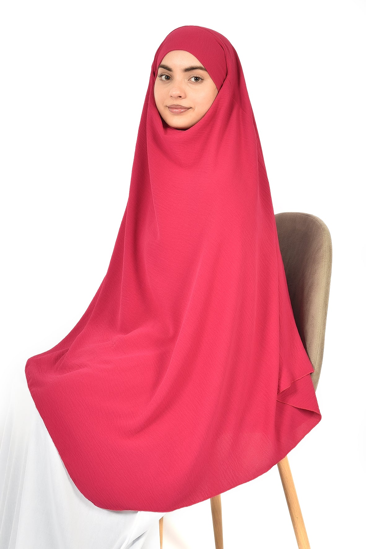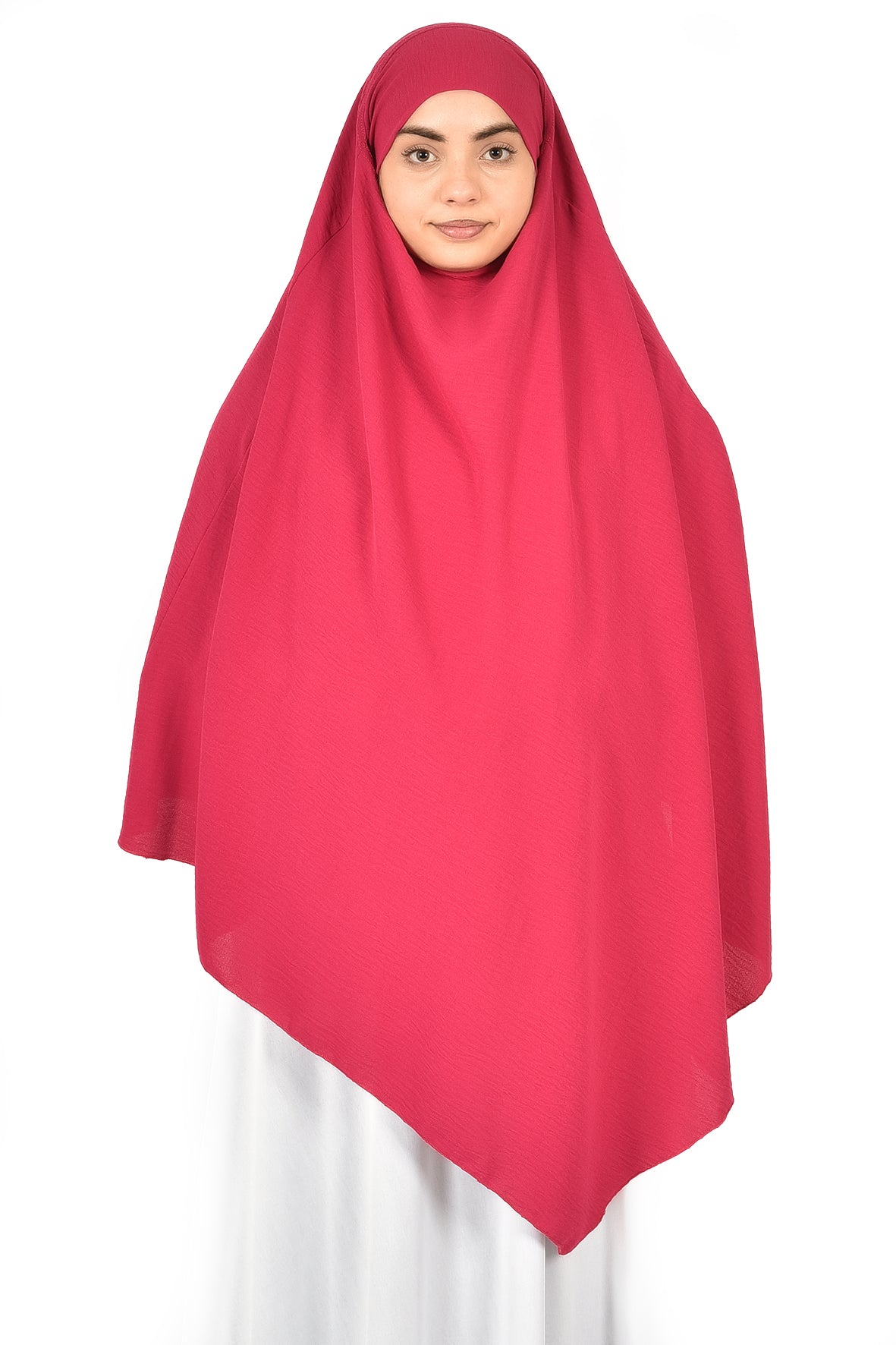 Enjoy a modest and stylish look with this elegant khimar in a striking dark fuchsia shade. Made from soft, breathable crepe fabric, it ensures maximum comfort throughout the day. Designed with full chest and shoulder coverage and a comfortable face opening, it’s perfect for all seasons. Available in multiple colors to match your outfits, making it a practical and elegant choice for any occasion.