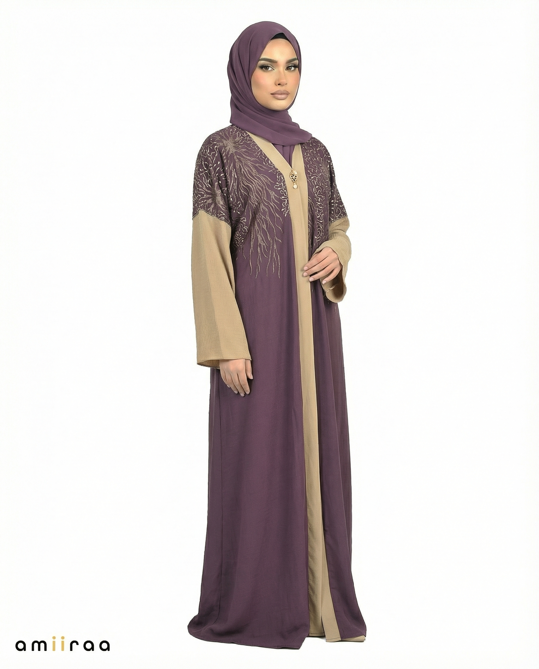 The design features a contrasting inner panel that enhances the layered look of the abaya, while the wide sleeves add an element of elegance and comfort. The carefully placed embroidery across the top creates a luxurious focal point that blends traditional artistry with modern modest fashion.