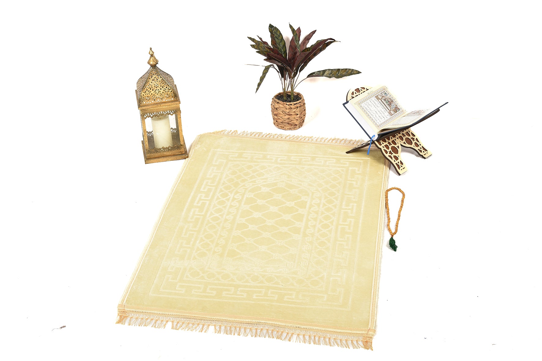 Make your prayer moments more comfortable and elegant with this luxury light golden beige velvet padded prayer mat.