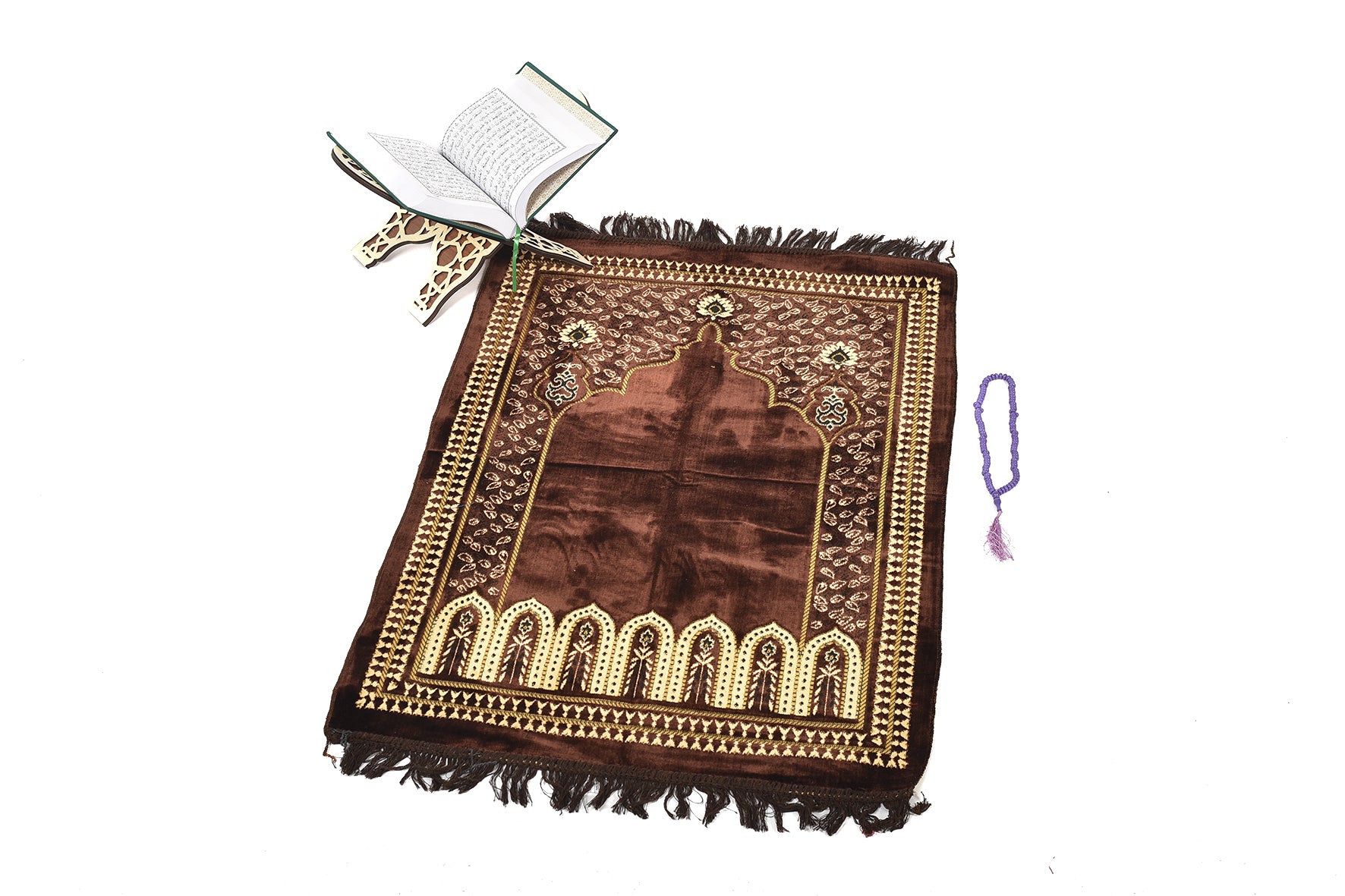 Add a touch of elegance and serenity to your prayers with this luxurious brown prayer rug, featuring rich gold Islamic embroidery. Made from soft and comfortable fabric, it's perfect for daily use or as a meaningful gift. Lightweight and foldable, ideal for travel or home.