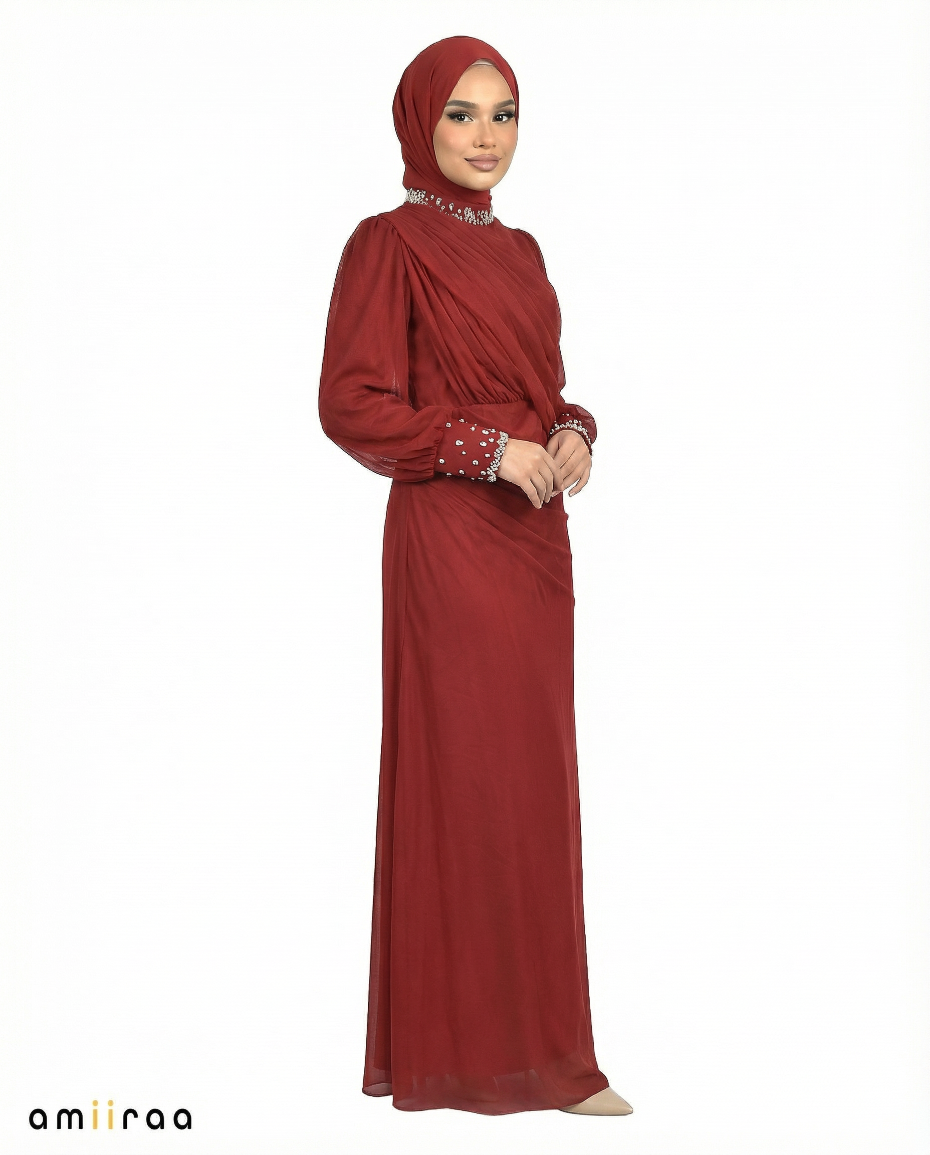 Gracefully draped and delicately embellished, this full-length chiffon gown is the definition of refined modest elegance.
