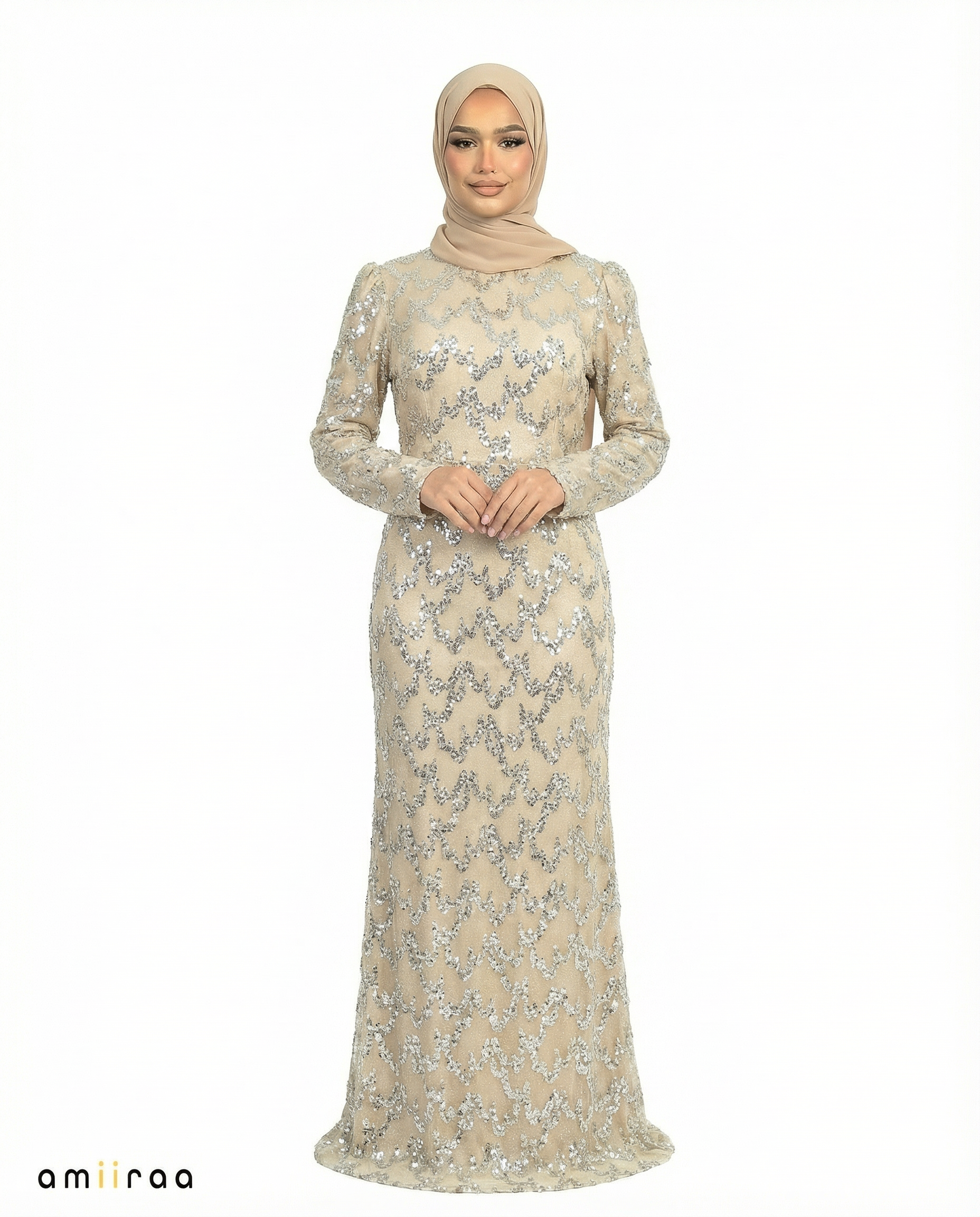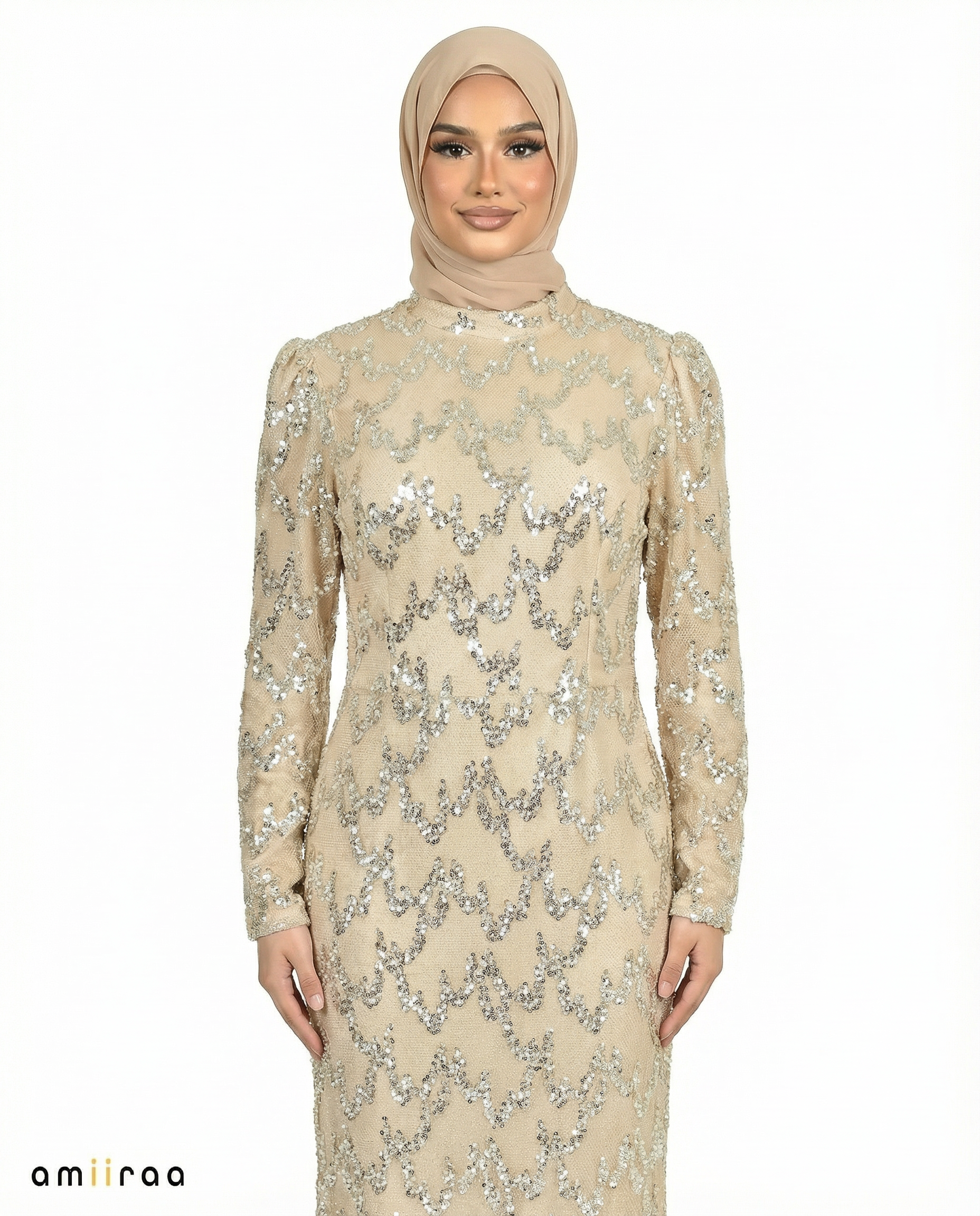 The intricate beadwork forms a repeating chevron-inspired pattern across the entire silhouette, adding depth and visual movement to the design. The long fitted sleeves and high neckline enhance its modest elegance, while the tailored cut accentuates the natural shape of the body without compromising comfort.
