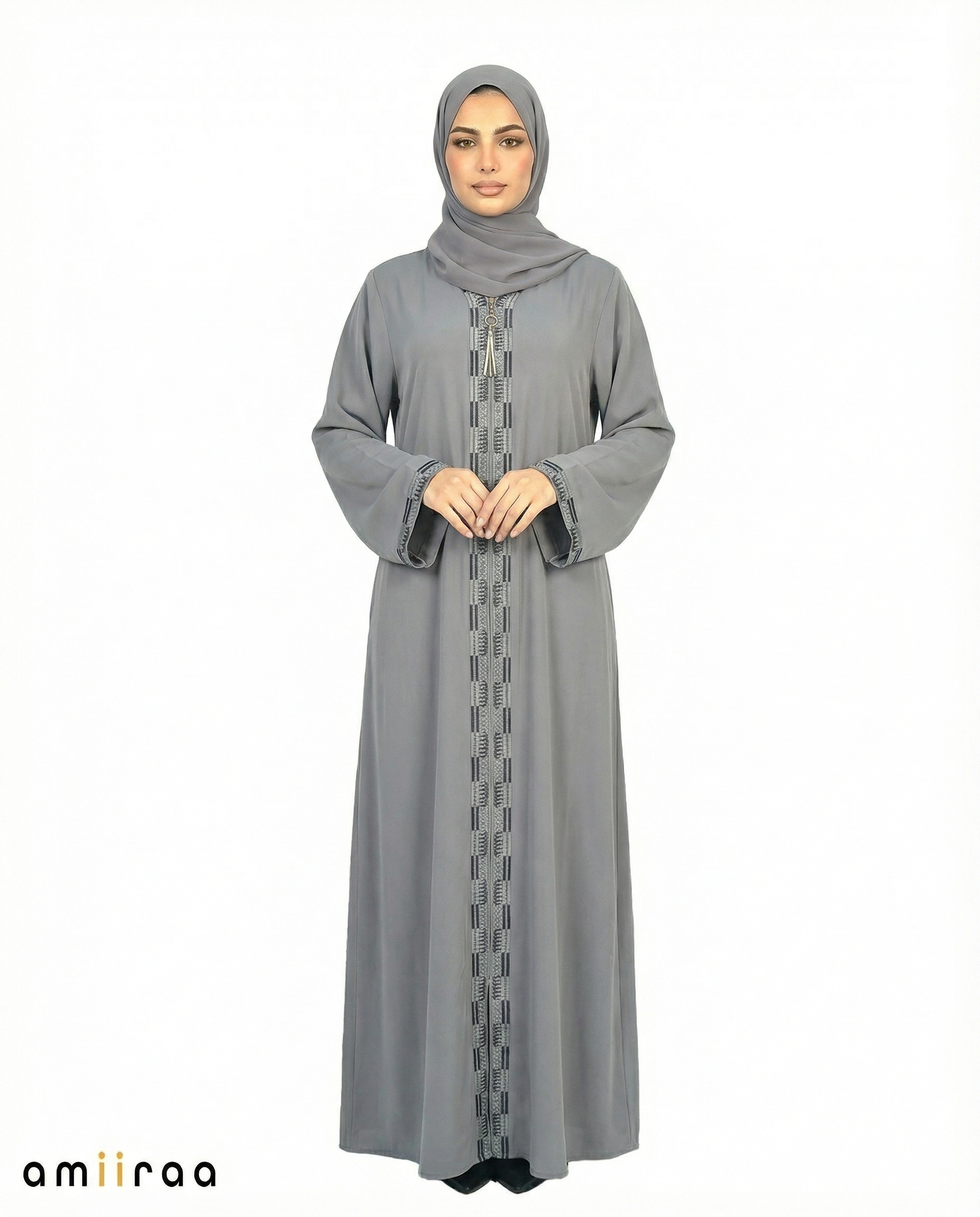Refined craftsmanship meets timeless elegance in the Amiiraa Embroidered Stone Detail Abaya. Designed to make a subtle yet striking statement, this piece features intricate vertical embroidery enhanced with delicate stone accents placed between the stitched patterns for a touch of understated shimmer.